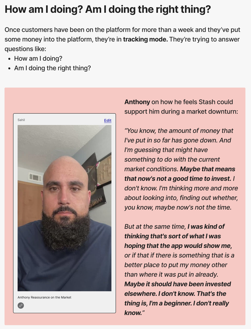 I was a senior UX researcher at Stash, during which I worked on the new user investing experience. I collaborated with two other researchers on the diary study. Along with them, we created “study groups” with many of our cross-functional partners in design, engineering, product management, and marketing, asking them to follow study participants along their 30 day study. We had consistent participation from 15 partners.